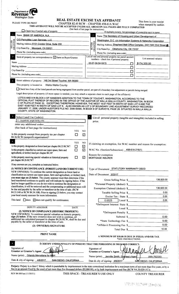 | 2 | 04/12/2017 | SWD | STATUTORY WARRANTY DEED | BANK OF AMERICA NA | SECRETARY OF HOUSING & URBAN DEVELOPMENT | | | $136,920.00 | 132189 | 2017-02745 |