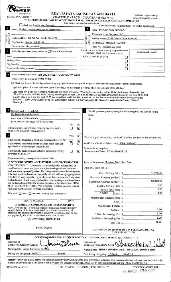 | 3 | 02/09/2017 | TRUSTEES D | TRUSTEE'S DEED | FUENTES JOSE V & MARIA E | BANK OF AMERICA NA | | | $136,920.00 | 131880 | 2017-01102 |