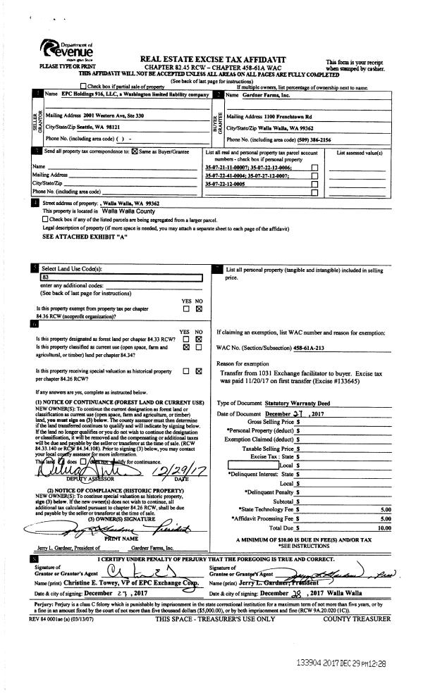 | 1 | 12/28/2017 | SWD | STATUTORY WARRANTY DEED | EPC HOLDINGS 916 LLC | GARDNER FARMS INC | | | $0.00 | 133904 | 2017-10492 |