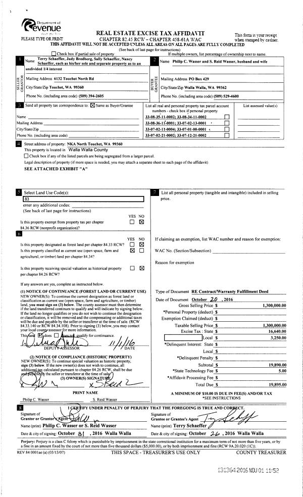 | 3 | 11/01/2016 | REAL ESTAT | REAL ESTATE CONTRACT | SCHAEFFER TERRY L ET AL | WASSER PHILIP C & S REID | | 8-PARCELS | $1,300,000.00 | 131364 | 2016-09073 |