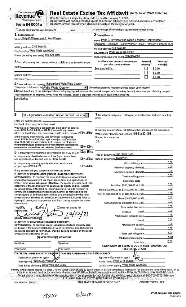 | 1 | 12/22/2021 | QCD | QUIT CLAIM DEED | WASSER PHILIP C & S REID | WASSER PHILIP C R ET AL | | | | 143107 | 2021-14970 |