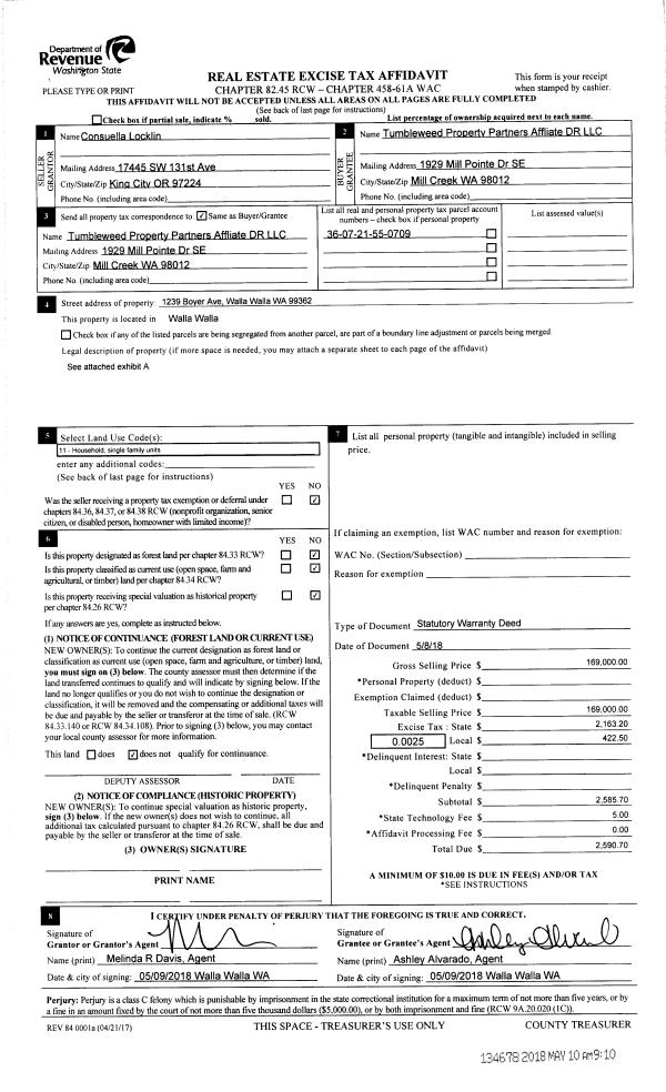 | 1 | 08/17/2018 | SWD | STATUTORY WARRANTY DEED | WEIDERT L W FARMS INC | VFO WALLA WALLA LLC | | 16-PARCELS | $14,880,000.00 | 135358 | 2018-06792 |
