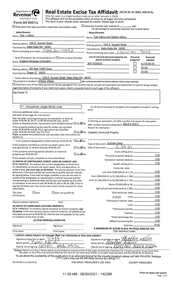 | 1 | 08/30/2021 | QCD | QUIT CLAIM DEED | ADKINS TYLER J | ADKINS TYLER & HEATHER | | | | 142388 | 2021-10635 |