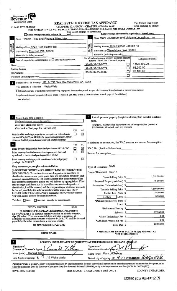 | 2 | 08/04/2017 | SWD | STATUTORY WARRANTY DEED | TILLEY RONALD L & RHONDA K | LOUNSBURY MARK & VIVIANNE | | 3-PARCELS | $0.00 | 132920 | 2017-05972 |