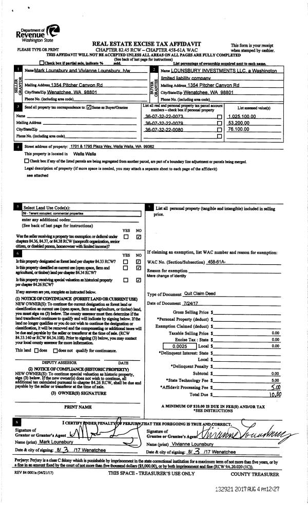 | 2 | 08/04/2017 | SWD | STATUTORY WARRANTY DEED | TILLEY RONALD L & RHONDA K | LOUNSBURY MARK & VIVIANNE | | 3-PARCELS | $0.00 | 132920 | 2017-05972 |