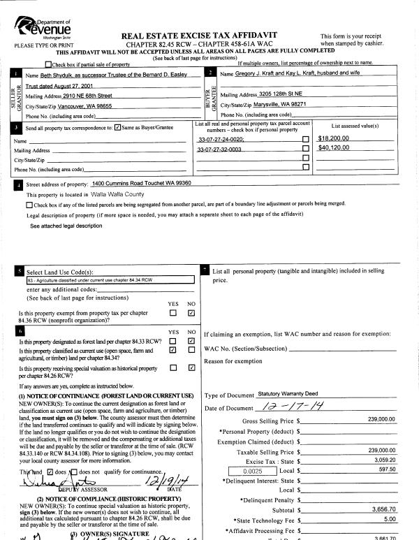 | 1 | 12/19/2014 | SWD | STATUTORY WARRANTY DEED | EASLEY BERNARD D TRUST | KRAFT GREGORY J & KAY L | | 2-PARCELS | $239,000.00 | 127140 | 2014-09246 |