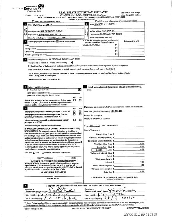 | 2 | 08/11/2015 | QCD | QUIT CLAIM DEED | SMITH DON & KIM | SMITH KIMBERLY K | | | $0.00 | 128751 | 2015-07750 |