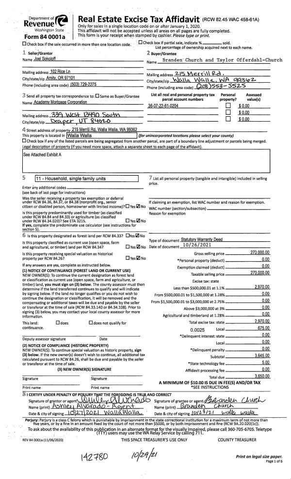 | 2 | 10/29/2021 | SWD | STATUTORY WARRANTY DEED | SOKOLOFF JOEL | CHURCH BRANDEN & TAYLOR OFFERDAHL-CHURCH | | | $270,000.00 | 142780 | 2021-13087 |