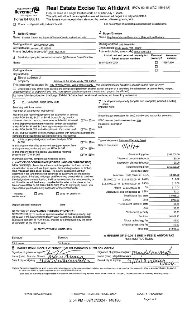 | 1 | 09/12/2024 | SWD | STATUTORY WARRANTY DEED | CHURCH BRANDEN & TAYLOR OFFERDAHL-CHURCH | MATA MAGDALENA & ISAAC ALEXIS | | | $365,000.00 | 148186 | 2024-05214 |