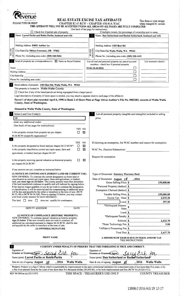 | 1 | 08/19/2016 | SWD | STATUTORY WARRANTY DEED | PARLIN LARROL & ROBIN | SUTHERLAND DAN & RACHEL | | | $159,000.00 | 130862 | 2016-06654 |