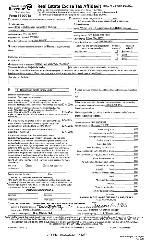 | 1 | 12/28/2021 | QCD | QUIT CLAIM DEED | STUTZMAN DAROLD D & BARRONELLE H | 708 HART LANE LLC | | | $0.00 | 143277 | 2022-00623 |