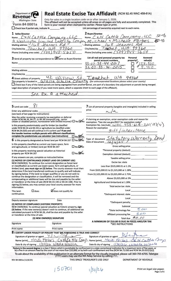 | Mailing Address: | 168 JEANNES RD TOUCHET, WA 99360 | % Ownership: | 100.0000000000% |