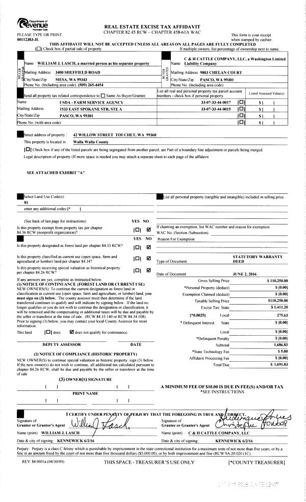 | 1 | 06/03/2016 | SWD | STATUTORY WARRANTY DEED | LASCH WILLIAM J | C & H CATTLE COMPANY LLC | | 2-PARCELS | $110,250.00 | 130335 | 2016-04157 |
