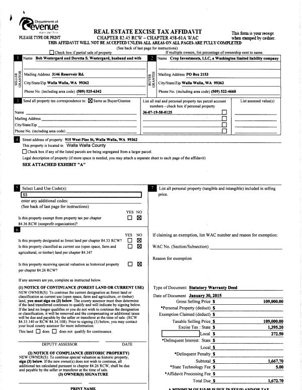 | 1 | 02/02/2015 | SWD | STATUTORY WARRANTY DEED | WESTERGARD BOB & DORETTA | CROP INVESTMENTS LLC | | | $109,000.00 | 127375 | 2015-00974 |
