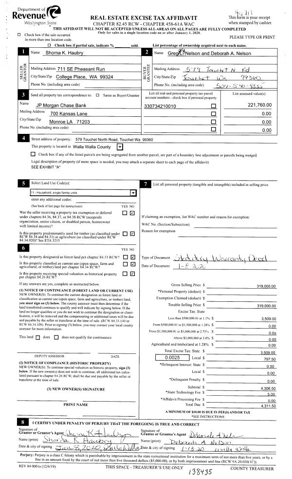 | 1 | 01/15/2020 | SWD | STATUTORY WARRANTY DEED | HAUBRY SHORNA K | NELSON GREGORY L & DEBORAH A | | | $319,000.00 | 138435 | 2020-00421 |