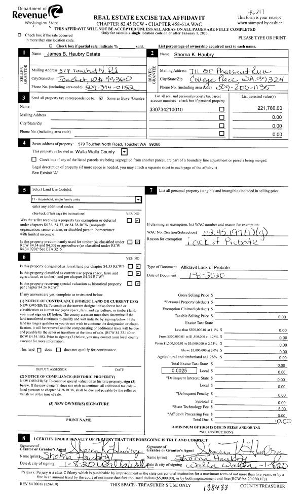 | 2 | 01/15/2020 | LOPA | LACK OF PROBATE AFFIDAVIT | HAUBRY JAMES B ESTATE OF | HAUBRY SHORNA K | | | $0.00 | 138433 | 2020-00420 |