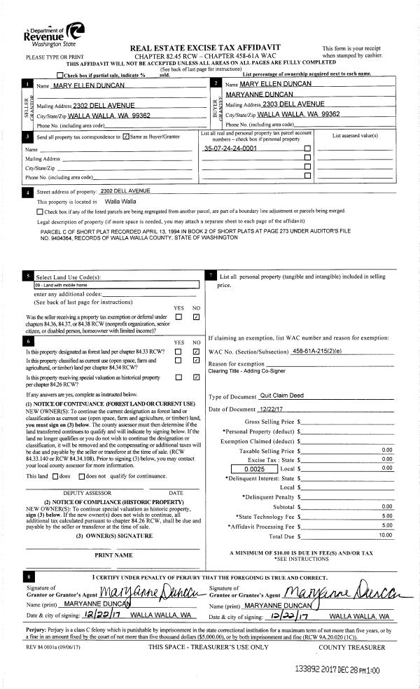 | 3 | 12/22/2017 | QCD | QUIT CLAIM DEED | DUNCAN MARY E | DUNCAN MARY ELLEN | | | $0.00 | 133892 | 2017-10458 |