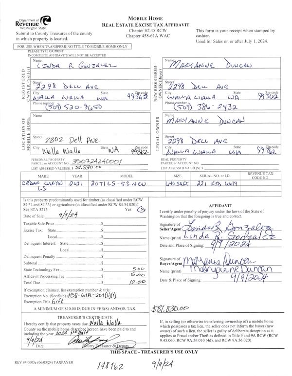 | 1 | 09/09/2024 | MH AFFIDAV | MOBILE HOME AFFIDAVIT | GONZALEZ LINDA R | DUNCAN MARYANNE | | | | 148162 | MHAFF-148162 |
