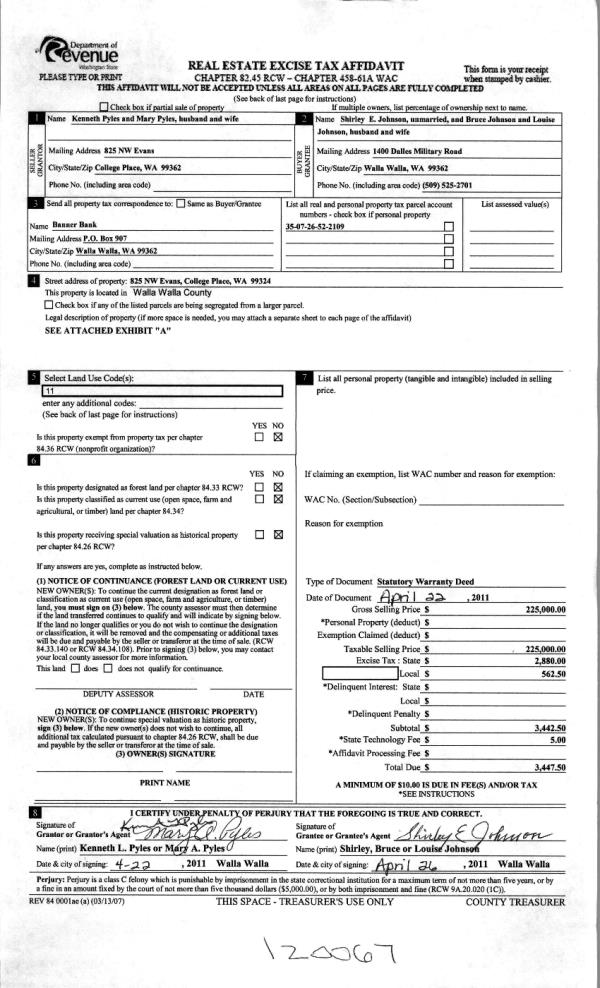 | 3 | 04/29/2011 | WARRANTY D | WARRANTY DEED | PYLES, KENNETH L & MARY A | JOHNSON, BRUCE & LOUISE | | | $225,000.00 | 120067 | 2011-03442 |