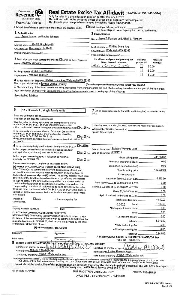 | 1 | 06/28/2021 | SWD | STATUTORY WARRANTY DEED | JOHNSON BRUCE & LOUISE | FLANNERY JASON T & ABIGAIL | | | $440,000.00 | 141908 | 2021-07846 |
