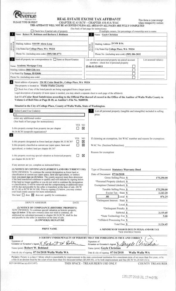 | 1 | 07/17/2018 | SWD | STATUTORY WARRANTY DEED | BOHLMAN ROBERT W | CHRISTIAN GAYLE | | | $175,250.00 | 135137 | 2018-05801 |