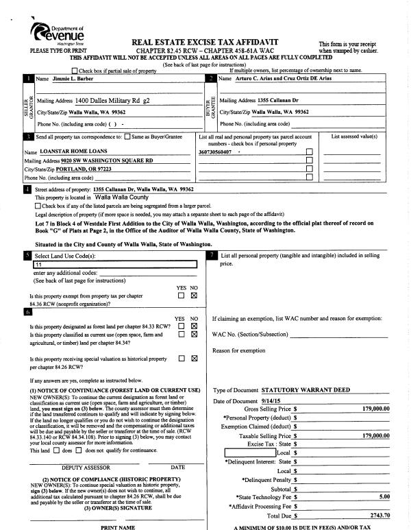 | 3 | 09/15/2015 | SWD | STATUTORY WARRANTY DEED | BARBER JIMMIE & MARY | ARIAS ARTURO C | | | $179,000.00 | 128814 | 2015-08066 |