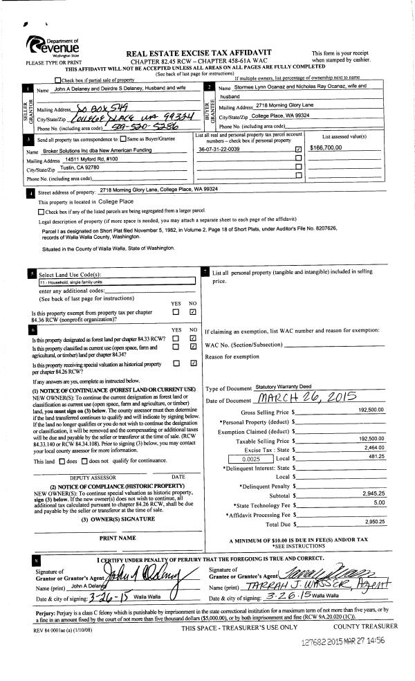 | 3 | 03/27/2015 | SWD | STATUTORY WARRANTY DEED | DELANEY JOHN & DEIRDRE | OCANAZ NICHOLAS RAY & STORMEE LYNN | | | $192,500.00 | 127682 | 2015-02541 |