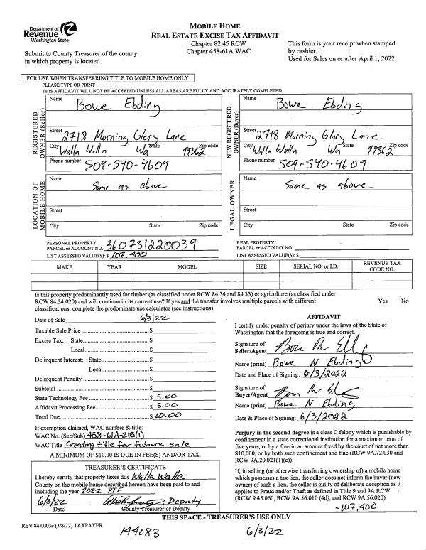 | 1 | 06/03/2022 | MH AFFIDAV | MOBILE HOME AFFIDAVIT | EBDING BOWE N | EBDING BOWE N | | | | 144083 | MHAFF-144083 |