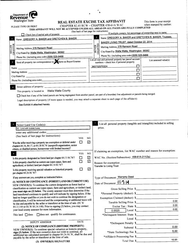 | 1 | 11/07/2014 | WARRANTY D | WARRANTY DEED | BAKER GREGORY A | BAKER LIVING TRUST | | | $0.00 | 127382 | 2015-01002 |