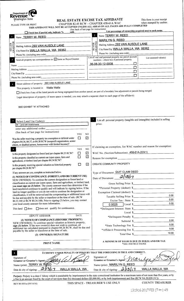 | 3 | 02/13/2017 | QCD | QUIT CLAIM DEED | REED TERRY W | REED TERRY W & MARILYN G | | | | 131916 | 2017-01329 |