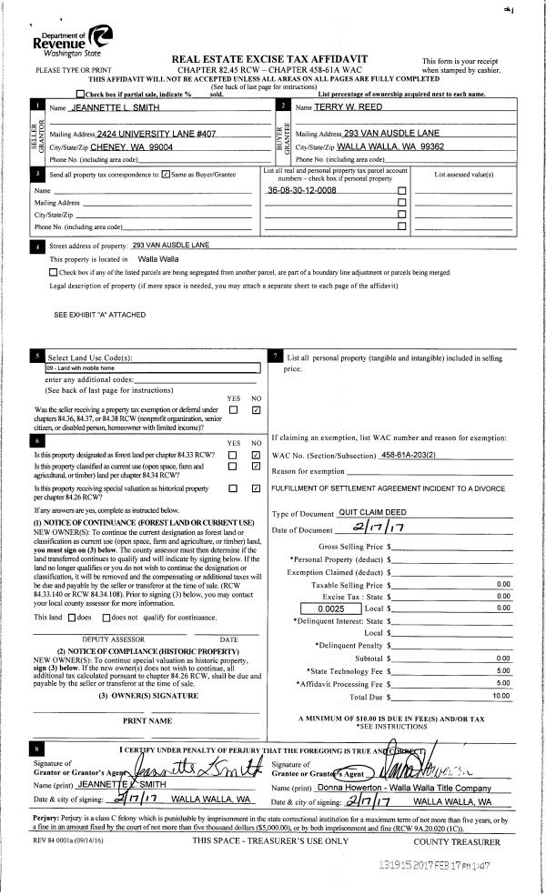 | 4 | 02/17/2017 | QCD | QUIT CLAIM DEED | REED TERRY W & JEANNETTE | REED TERRY W | | | | 131915 | 2017-01328 |