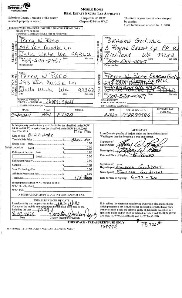 | 2 | 08/27/2020 | MH AFFIDAV | MOBILE HOME AFFIDAVIT | REED TERRY W & MARILYN G | GODINEZ ERASMO SEGURA | | | $8,000.00 | 139774 | MHAFF-139774 |