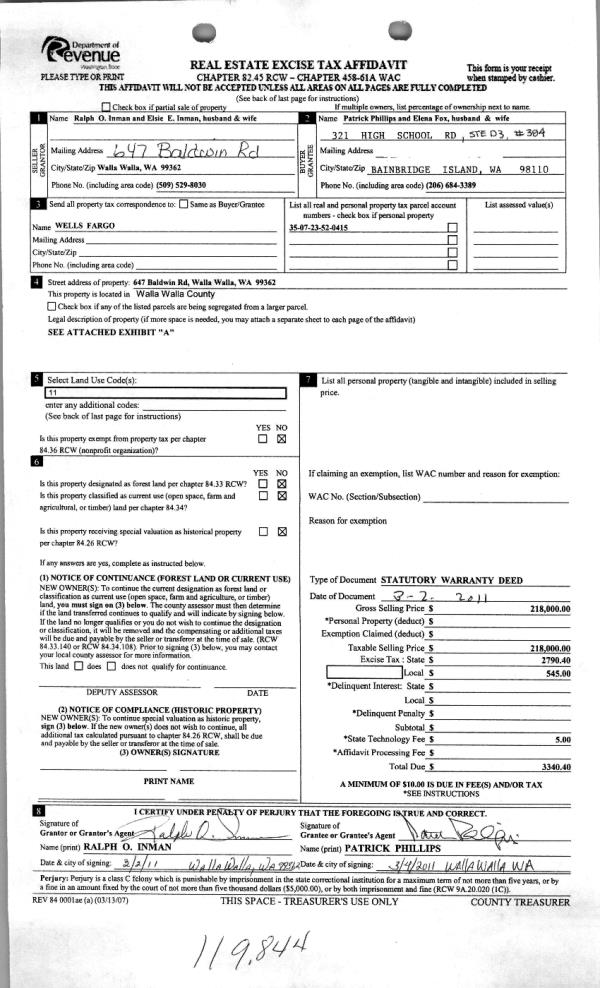 | 2 | 03/04/2011 | WARRANTY D | WARRANTY DEED | INMAN, RALPH O & ELSIE E | PHILLIPS, PATRICK | | | $218,000.00 | 119844 | 2011-02046 |
