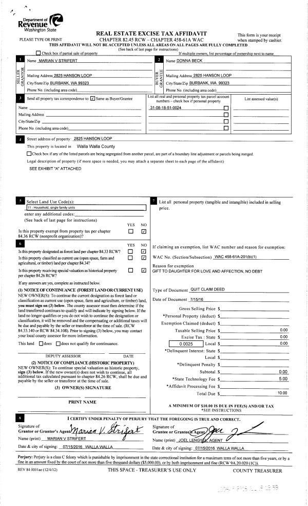 | 1 | 07/15/2016 | QCD | QUIT CLAIM DEED | STRIFERT DONALD J | BECK DONNA M | | | $0.00 | 130645 | 2016-05601 |