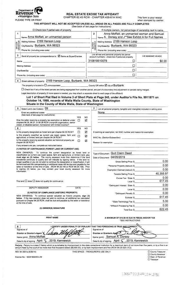 | 2 | 04/05/2019 | QCD | QUIT CLAIM DEED | MOFFAT ANNA | MOFFATT ANNA | | | $40,356.00 | 136647 | 2019-02244 |