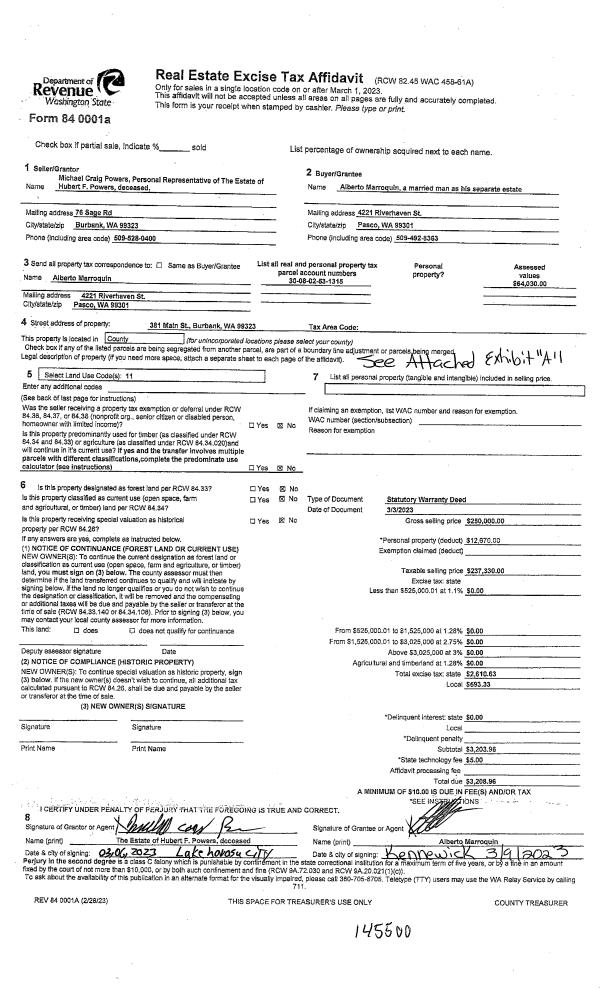 | 3 | 03/10/2023 | MH AFFIDAV | MOBILE HOME AFFIDAVIT | POWERS HUBERT F ESTATE OF | MARROQUIN ALBERTO | | | $9,870.00 | 145503 | MHAFF-145503 |