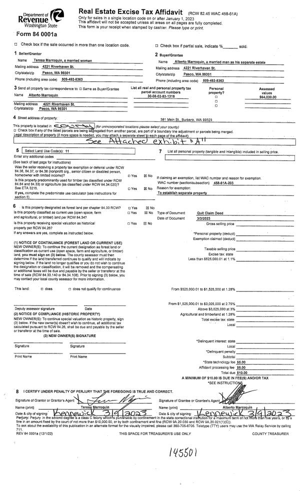 | 1 | 03/10/2023 | QCD | QUIT CLAIM DEED | MARROQUIN TERESA | MARROQUIN ALBERTO | | | | 145501 | 2023-01251 |