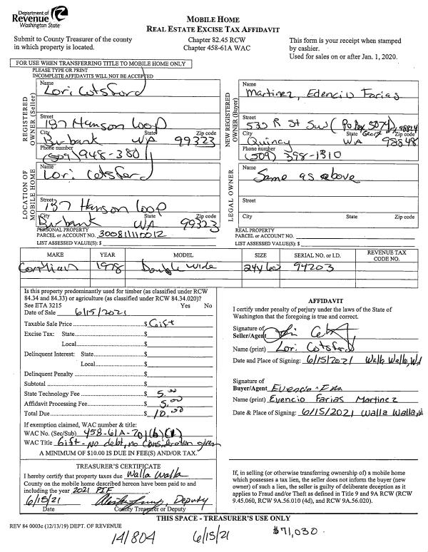 | 1 | 06/15/2021 | MH AFFIDAV | MOBILE HOME AFFIDAVIT | COTSFORD LORI A | FARIAS MARTINEZ EVENCIO | | | | 141804 | MHAFF-141804 |