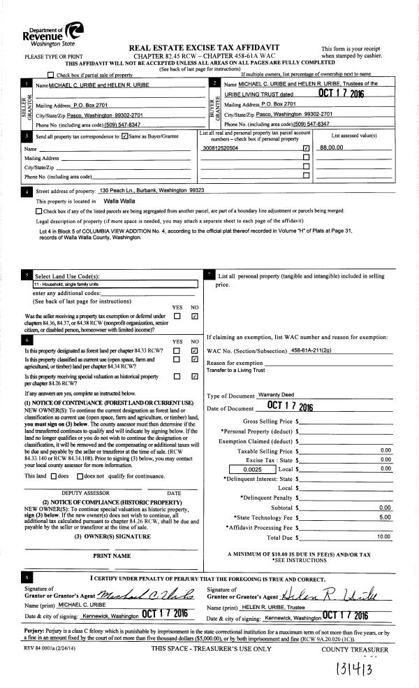 | 1 | 10/17/2016 | WARRANTY D | WARRANTY DEED | URIBE MICHAEL C & HELEN R | URIBE LIVING TRUST | | | | 131413 | 2016-09353 |