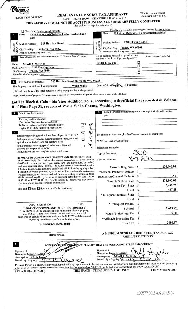 | 4 | 08/10/2015 | SWD | STATUTORY WARRANTY DEED | LEAHY CHRIS & CHRISTINE | MC BRIDE MIKELL A | | | $174,900.00 | 128577 | 2015-06905 |