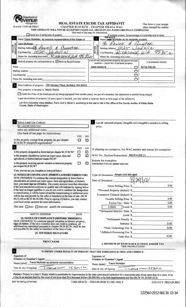 | 2 | 08/30/2012 | WARRANTY D | WARRANTY DEED | MC ALISTER, LEON ESTATE OF | MC ALISTER, TRAVIS | | | $0.00 | 122560 | 2012-07608 |