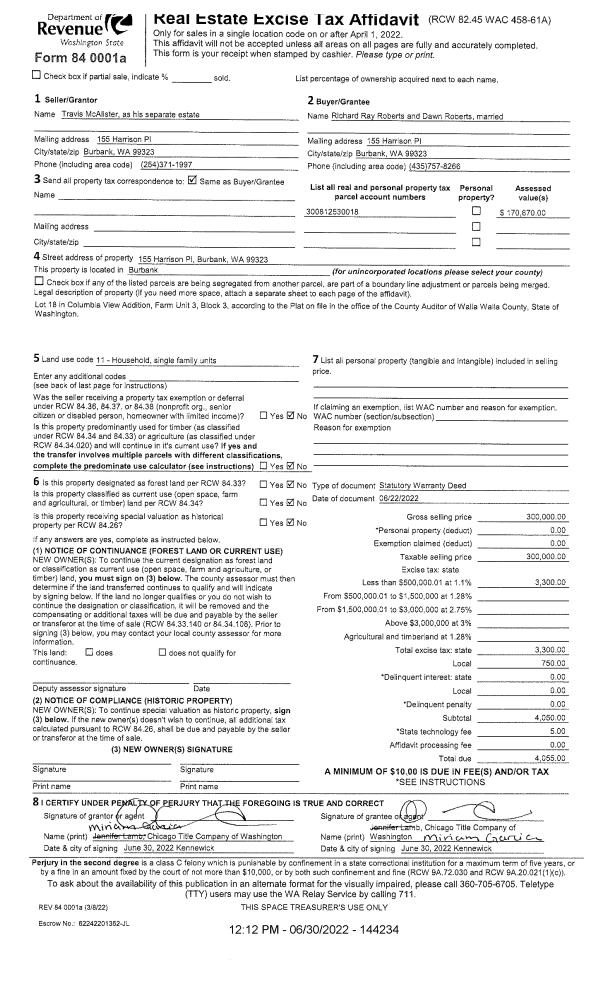| 1 | 06/30/2022 | SWD | STATUTORY WARRANTY DEED | MCALISTER TRAVIS MARK | ROBERTS RICHARD RAY & DAWN | | | $300,000.00 | 144234 | 2022-05542 |