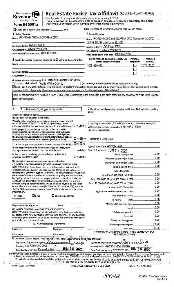 | 1 | 07/08/2022 | WARRANTY D | WARRANTY DEED | DIAZ RAYMOND & NINA | DIAZ LIVING TRUST | | | $0.00 | 144268 | 2022-05781 |