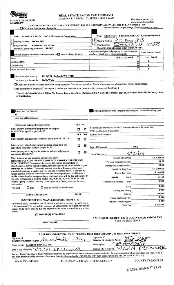| 4 | 08/20/2014 | SWD | STATUTORY WARRANTY DEED | BARRETT CAPITAL INC | SCOTT STEVEN & SHERRI | | | $128,500.00 | 126534 | 2014-06276 |