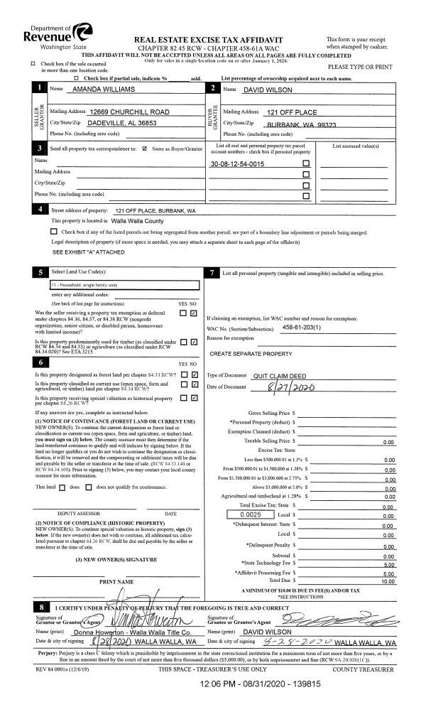 | 1 | 08/31/2020 | QCD | QUIT CLAIM DEED | WILLIAMS AMANDA | FINLEY MARGARET AND DAVID WILSON | | | | 139815 | 2020-08767 |