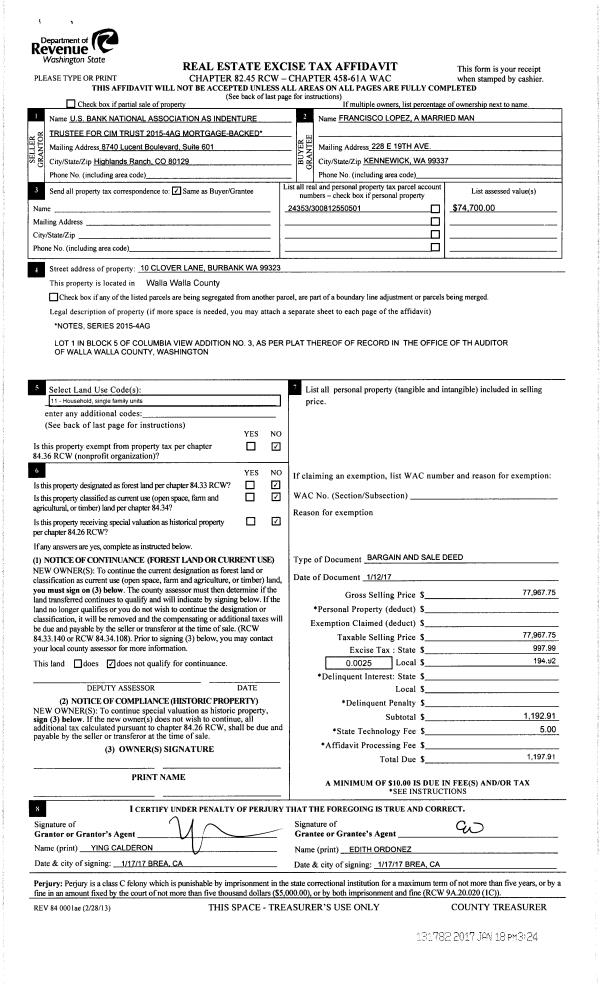 | 1 | 01/18/2017 | BARGAIN & | BARGAIN & SALE DEED | US BANK NATIONAL ASSOCIATION | LOPEZ FRANCISCO | | | $77,968.00 | 131782 | 2017-00471 |