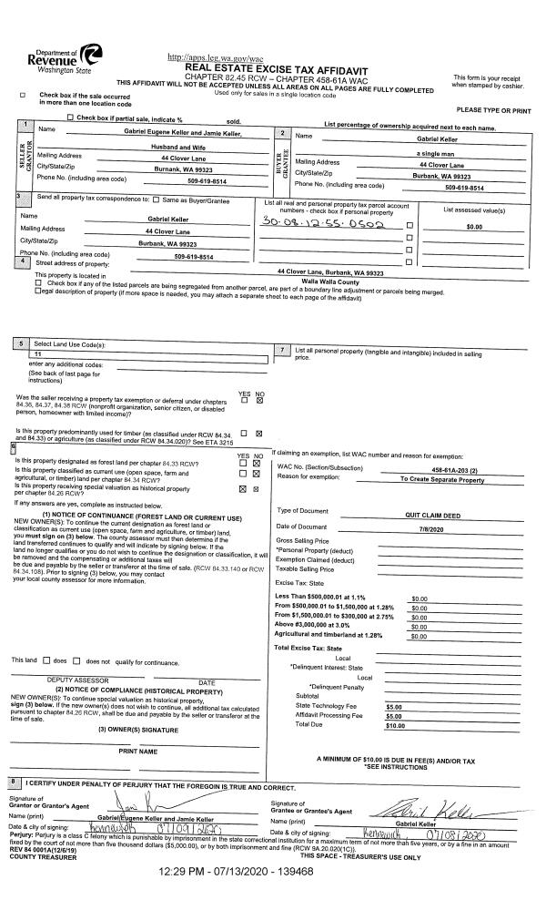 | 1 | 07/08/2020 | QCD | QUIT CLAIM DEED | KELLER GABRIEL EUGENE & JAIME | KELLER GABRIEL EUGENE | | | $0.00 | 139468 | 2020-06690 |