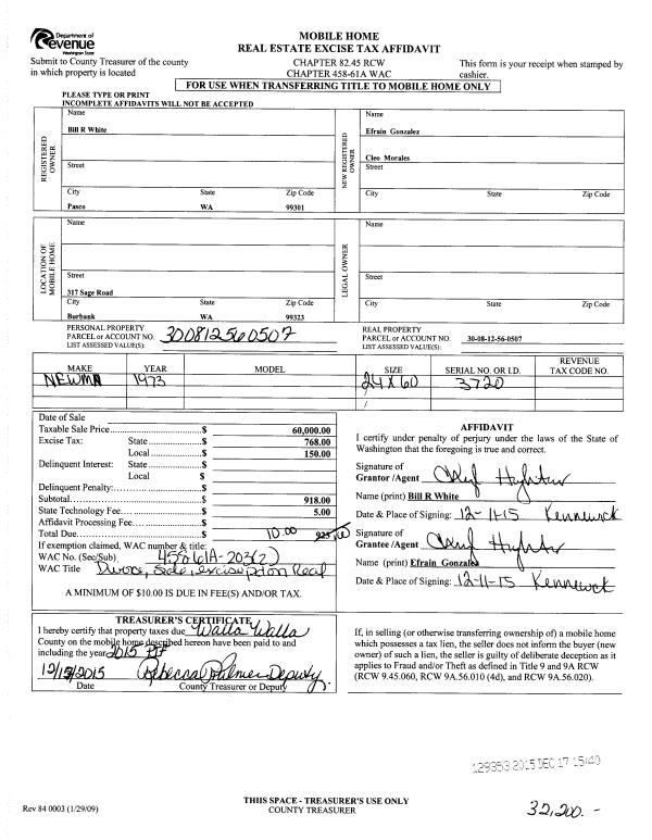 | 1 | 12/17/2015 | MH AFFIDAV | MOBILE HOME AFFIDAVIT | WHITE BILL R | GONZALEZ EFRAIN | | | $60,000.00 | 129353 | MHAFF-129353 |