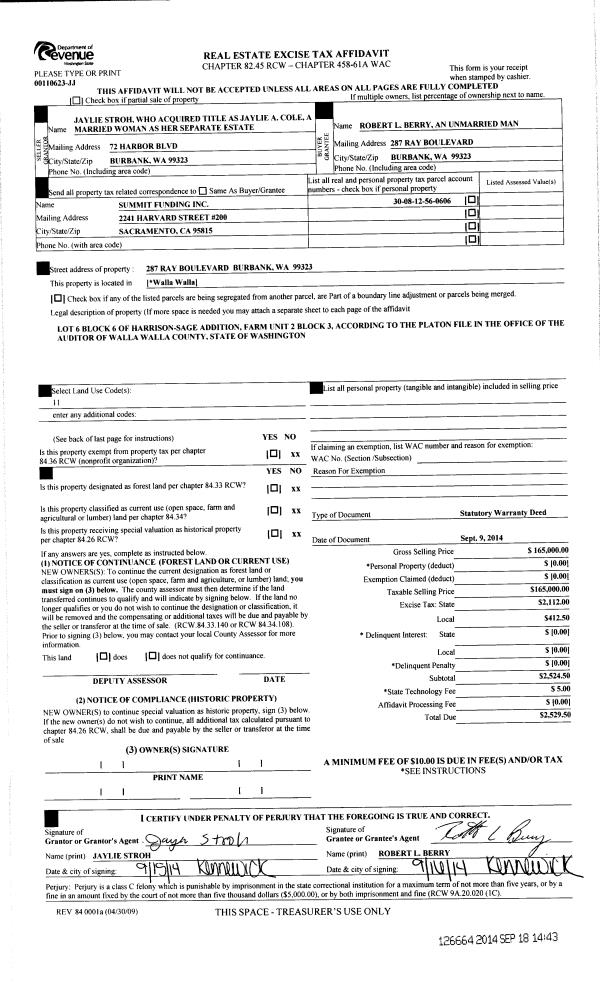 | 1 | 09/09/2014 | SWD | STATUTORY WARRANTY DEED | COLE JAYLIE A | BERRY ROBERT L | | | $165,000.00 | 126664 | 2014-06852 |