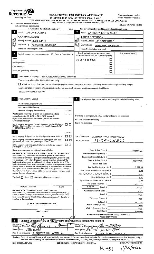 | 1 | 11/30/2020 | SWD | STATUTORY WARRANTY DEED | SLAVENS JASON & CARINN | ALLEN ANTHONY JUSTIN & LAURA EPPERSON | | | $302,000.00 | 140451 | 2020-12632 |